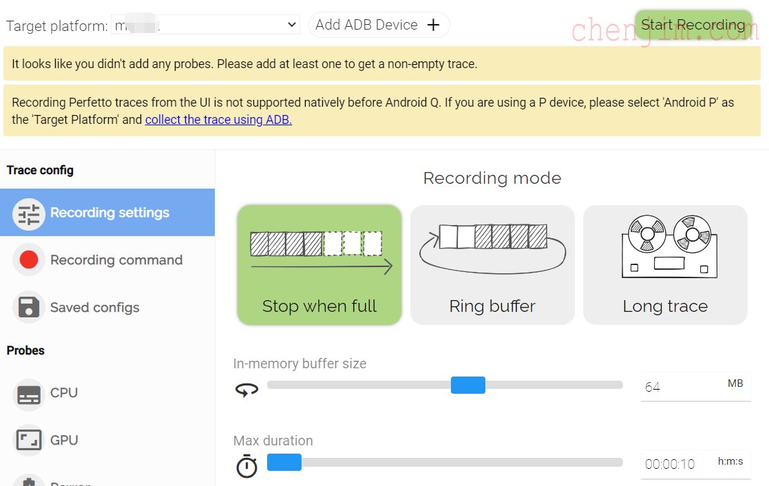 adb shell,然后执行perfetto相关命令,因为在某些情况 Ctrl+C不通过ADB传播而无法停止. - 在 Android 12 之前的非 root 设备上,由于过度限制的 SELinux 规则,配置只能通过 (cat config | adb shell perfetto -c -) 传递 。由于 Android 12