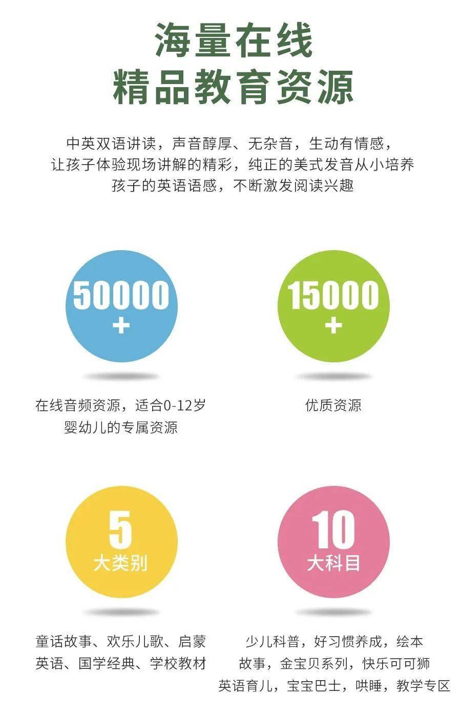 在小程序绑定设备后,还可以点播海量音频资源。从唐诗宋词、童话故事、欢乐儿歌到启蒙英语、学校教材,50000+适合0-12岁婴幼儿的专属资源、15000+优质教育资源,生动的中英双语讲解带孩子开拓视野。