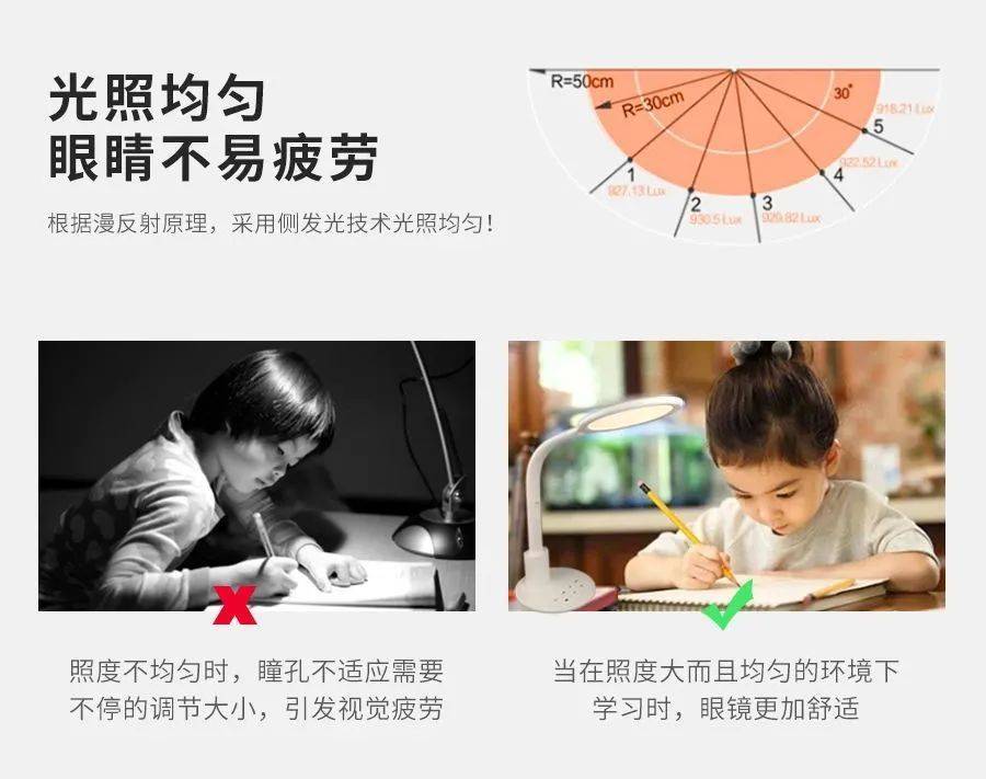 照度过低和光照不均匀将影响照明的清晰度和舒适度,容易引起视觉疲劳,可能导致近视。国标GB/T 9473对于读写作业台灯照明性能有明确的要求。标准规定,在进行读写作业的中央区域和边缘区域,灯具的照度和照度均匀度至少要达到A级,更好的是达到AA级,对色温、显色指数等均有要求。