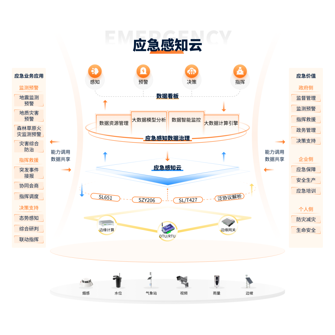 为应急感知数据应用,提供覆盖感知异构多源数据实时采集、汇聚、存储、治理、开发等全生命周期管理能力,支撑智慧应急多维度数据主题库,满足多场景数据分析应用,实现数据的一源多用,快速构建应急感知一张图,辅助应急精细化管理决策。
