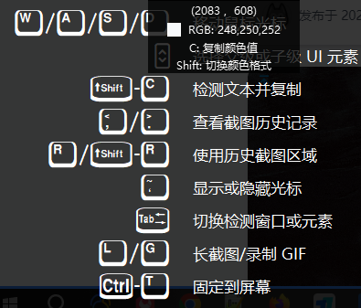 按住快捷键Ctrl+1,唤起截图窗口,通过快捷键c或者直接鼠标点击拾取即可获取当前节点色值,还可以通过Shift进行色值格式切换