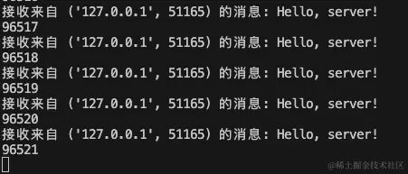 这里的客户端发送了100000个数据包,在服务端特意设置处理第一个数据包后停止10秒模拟数据处理时间。在这种情况下,就会因为速度过快,缓冲区满而导致数据包丢失。服务端最后的打印为