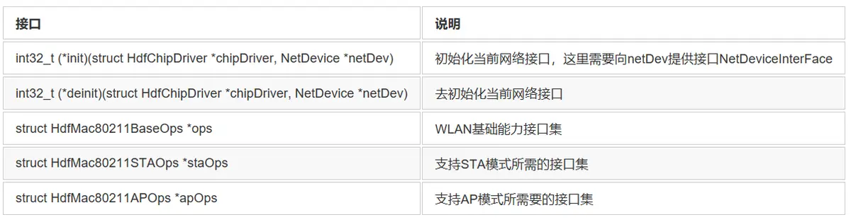 | int32_t (*InitChip)(struct HdfWlanDevice *device) | 初始化芯片 |