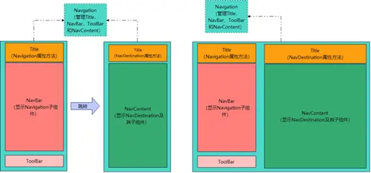 - NavContent:内容区域,默认首页显示导航内容(Navigation的子组件)或非首页显示(NavDestination的子组件),首页和非首页通过路由进行切换。
