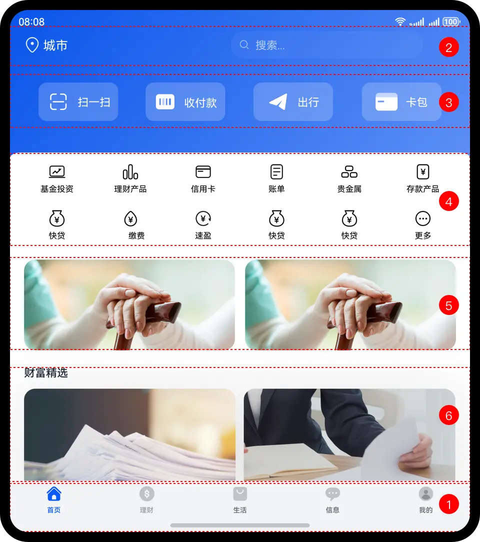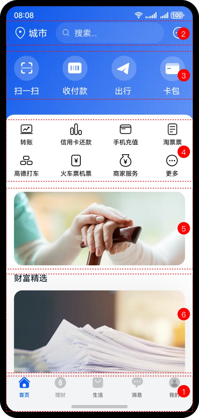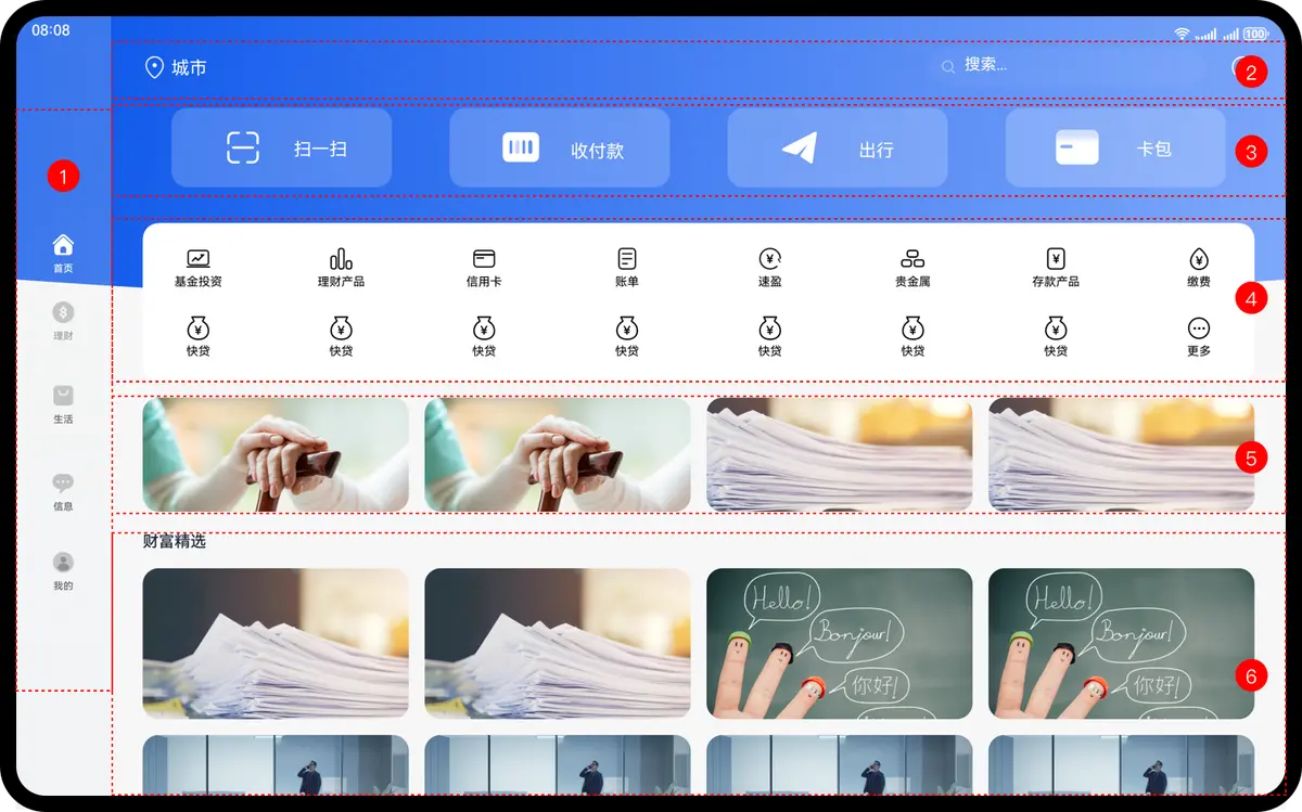 移动应用首页主要涉及扫一扫、支付、收付款等能力。观察首页在多设备上的UX设计图,可以进行如下设计: