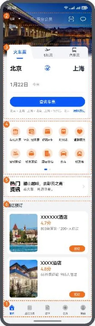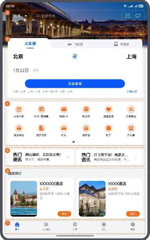 旅行订票应用首页主要发挥提供买票窗口的作用,解决用户订票以及预约酒店需求,所以首页内容都围绕这一功能设计。