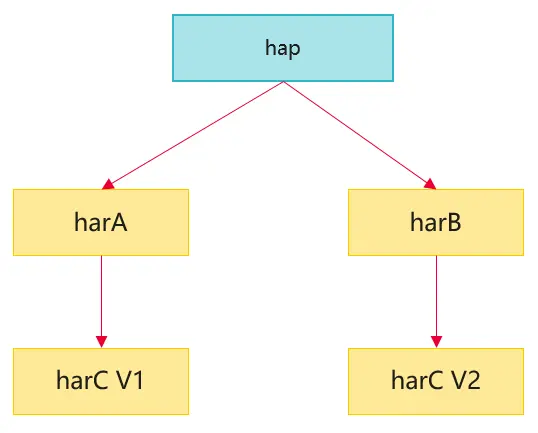 对于ohpm 1.5.0之前的版本,如果hap依赖了不同版本的har(如下图中V1版本的harC和V2版本的harC),在打包hap时,默认会把V1和V2两个版本的harC都打包到包中。开发者可以使用ohpm的 override 机制,指定只打包一份。