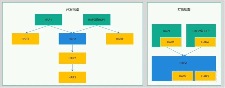 - 应用存在多包( HAP 、 HSP )的场景时,可以使用HSP动态共享包在应用的多个包(HAP、HSP)之间共享代码和资源,消除使用 HAR 静态共享包造成的多包(HAP、HSP)间代码和资源的重复拷贝,从而减小应用包大小。