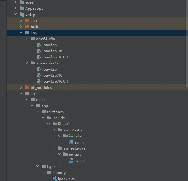 - 拷贝动态库到\entry\libs${OHOS_ARCH}\目录: 动态库需要在\entry\libs${OHOS_ARCH}\目录,才能集成到hap包中,所以需要将对应的so文件拷贝到对应CPU架构的目录