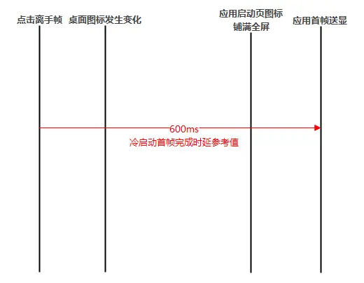 冷启动首帧完成时延的性能衡量的起点为用户点击应用图标离手点时间,止点为应用首帧送显的时间。