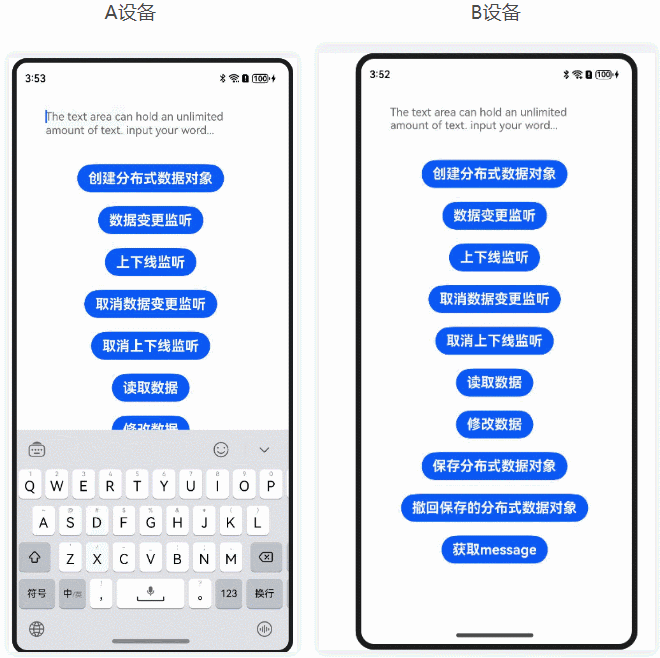 A、B两台设备分别点击创建分布式数据对象,并开启数据变更监听,此时在A设备输入数据,B设备即可自动同步。
