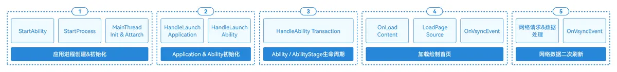在优化应用冷启动体验前,需要先了解应用冷启动的流程和几个重要的生命周期。应用冷启动的过程大致可分成以下四个阶段:应用进程创建&初始化、Application&Ability初始化、Ability/AbilityStage生命周期、加载绘制首页,如下图所示。