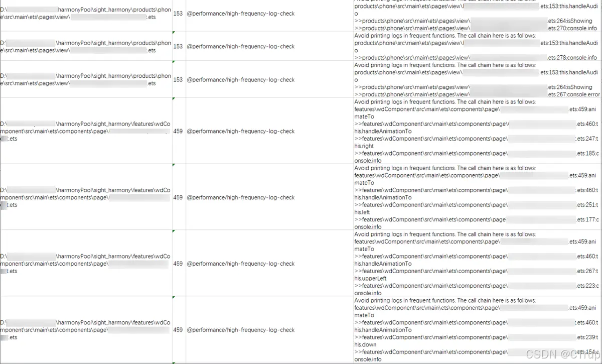 打开静态检查工具 Code Linter,点击扫描工程,扫描出总问题数“698”个,基于扫描结果文件,在“RuleName”列过滤出“@performance/high-frequency-log-check”规则相关的代码问题点,见下图。