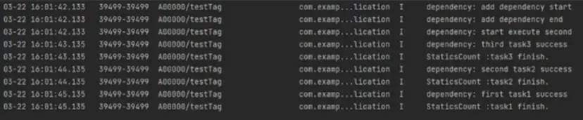 hilog.info(0x0000, 'testTag', 'dependency: first task1 success');
