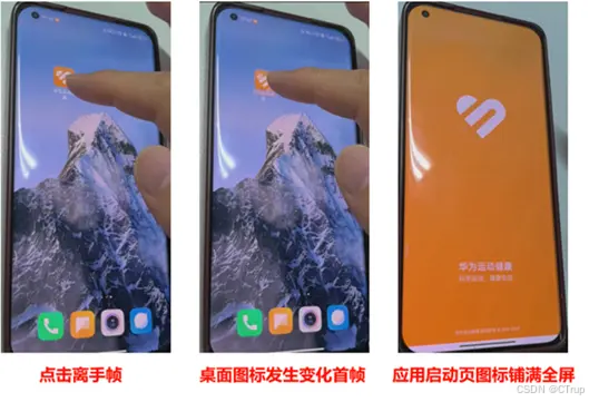 - 离手帧到应用启动图标铺满全屏首帧(减去广告时间)作为性能衡量起止点。