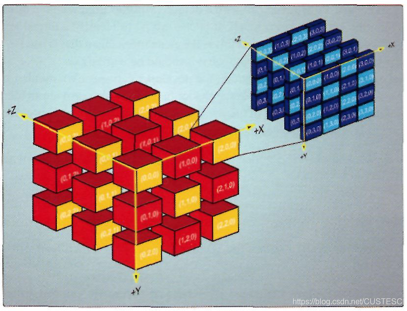 这里借一幅参考资料3中的图,来说明线程组和线程的关系。左边就是我们使用dispatch函数分配的线程组个数,其每个组对应了一个位置,右边则是一个线程组内的线程分布,这是由numthread所分配的。