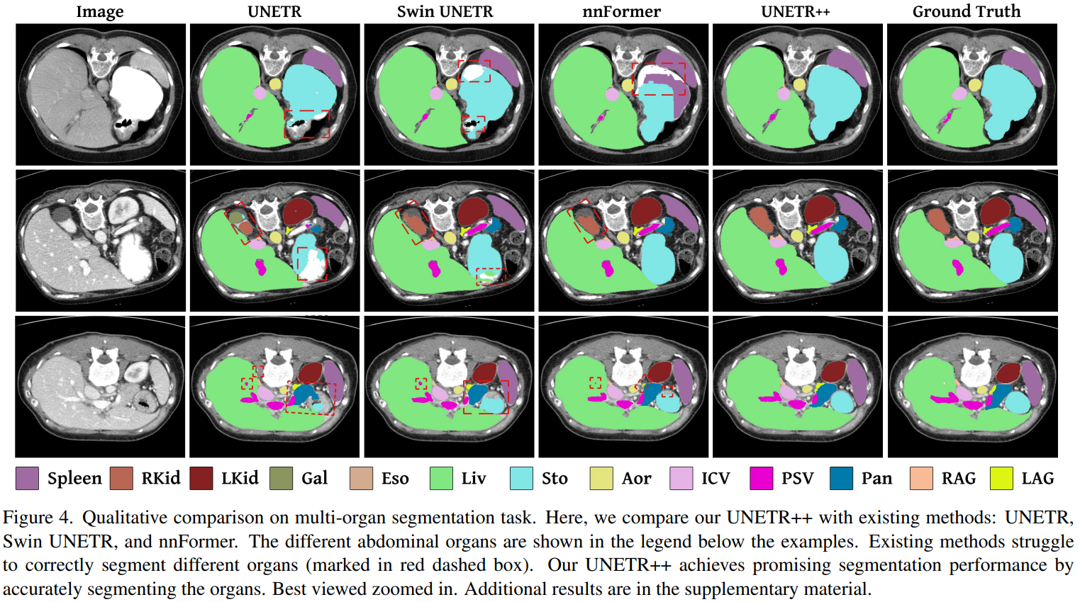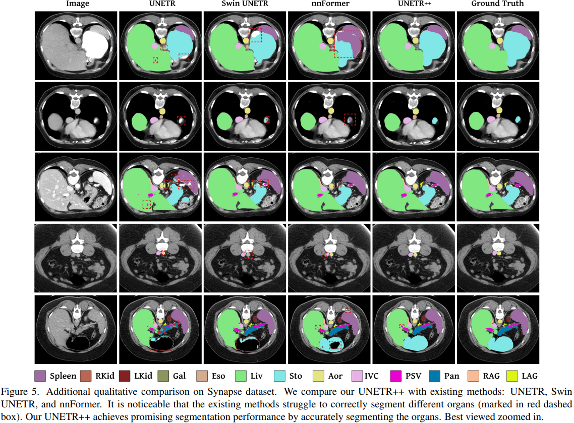 可以很清晰地观察到,无论是小体积还是粘连等复杂场景,UNETR++都能略胜一筹。