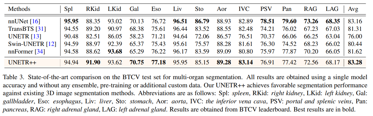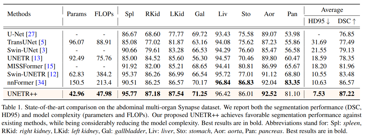 在abdominal multi-organ Synapse dataset中,对比SOTA模型,UNETR++仅用了其1/3的参数量和1/4的计算量取得了最高的精度。