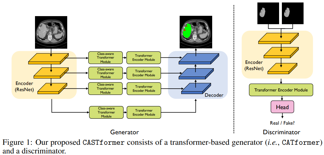 判别器试图在真实样本和假样本之间进行分类,Generator 和 Discrimitor 通过试图达到 minimax 博弈的平衡点来相互竞争。使用这种结构使鉴别器能够对远距离上下文依赖性进行建模,从而更好地评估医学图像的保真度,这也从本质上赋予了模型对解剖视觉模态(分类特征)的更全面的理解。