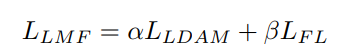 Focal Loss 创建了一种机制,可以更加强调模型难以分类的样本;通常,来自少数群体的样本将属于这一类。相比之下,LDAM Loss 通过考虑数据集的类别分布来判断权重。我们假设与单独使用每个功能相比,同时利用这两个功能可以产生有效的结果。因此,作者提出的 Large Margin aware Focal (LMF) 损失是 Focal 损失和由两个超参数加权的 LDAM 的线性组合,公式如下: