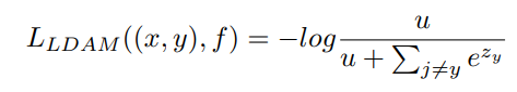 这里 $ j \in {1, …, k} $ 表示特定类,$ n_{j} $ 表示每个类别的样本数,$ C $ 为固定的常数。现在,让我们定义出一个样本对 ( x , y ) (x, y) (x,y), x x x 为样本, y y y为对应的标签,同时给定一个模型 f f f。考虑下面这个函数映射:$ z_{y} = f(x)_{y} $;我们令 u = e z y − p y u=e^{z_{y}-p_{y}} u=ezy−py,这里对于每一个类别 j ∈ 1 , . . . , k j\in{1,...,k} j∈1,...,k 都有 p j = C n j 1 / 4 p_{j}=\frac{C}{n_{j}^{1/4}} pj=nj1/4C。因此,LDAM 损失便可以定义为: