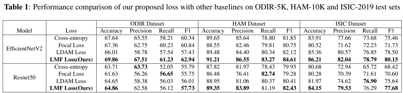上述表格显示了本文所提出的方法和基线模型在上述三个数据集上的结果。结果表明,在大多数情况下,所提出的 LMF 优于交叉熵损失以及流行的Focal Loss 和 LDAM Loss。 例如,对于 ODIR-5K 测试集,我们可以看到本文提出的方法分别从 EfficientNetv2 和 ResNet50 获得了 62.94 和 57.73 f1得分,性能提高了 2.5% 以上。 对于 HAM10k 数据集,该方法实现了近 3% 的性能提升。 ISIC-2019 的改进最为显着。 当与预训练的 EfficientNetv2 一起使用时,提议的 LMF 实现了近 5% 的性能提升。使用更大的预训练 ResNet50,与 f1 方面的其他方法相比,性能提高了近 10%。 值得注意的是,在其他指标中,例如准确性、精度和召回率,本文提出的方法几乎在所有情况下都优于其他方法。