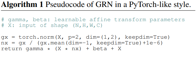 在这项工作中,全局响应归一化的引入主要旨在增加通道的对比度和选择性。具体地,给定一个输入特征 $ X \in R^{H×W×C} $,所提出的 GRN 单元包括三个步骤: