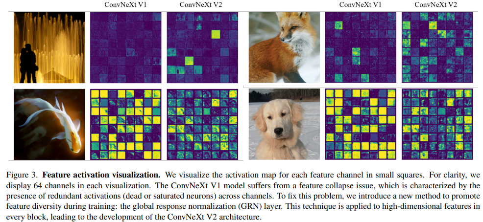 受掩码自编码机制的启发,本文在 ConvNeXt 的架构基础上延伸出了一个完全卷积掩码自编码器框架——ConvNeXt V2,同时作者设计了一个全新的全局响应归一化(Global Response Normalization, GRN)层以增强原始 ConvNeXt 模块通道间的特征竞争,从而捕获更具有判别力的通道特征。