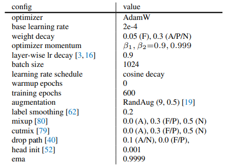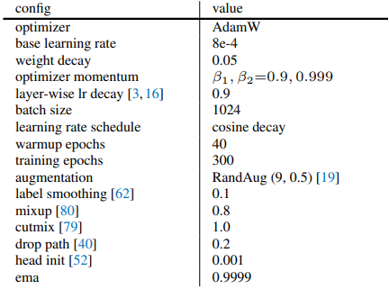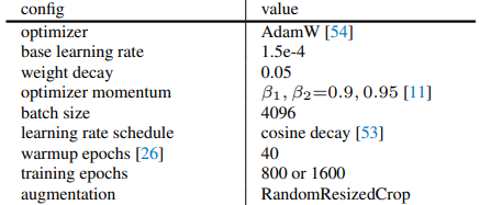 这里目标重构的方式同 MAE 类似,也是采用 MSE 来衡量损失,目标是原始输入的 patch-wise 归一化图像,并且损失仅应用于 mask 过后的 patch。在具体的训练步骤中,作者基于 ImageNet-1K 数据集进行了 800 轮 epochs 的预训练并额外微调了 100 轮 epochs。