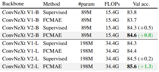 此外,当配备 GRN 时,FCMAE 预训练模型可以显着优于 300 个 epoch 的监督模型。GRN 通过增强特征多样性来提高表示质量,这在原始的 ConvNeXt 模型中是不存在的,但已被证明对于基于掩码的预训练至关重要。值得一提的是,这种改进是在不增加额外参数开销或增加 FLOPS 的情况下实现的。