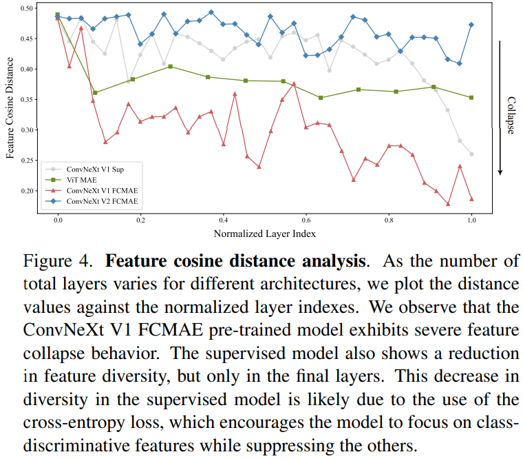 从图 3 中的可视化和图 4 中的余弦距离分析,我们可以观察到 ConvNeXt V2 有效地缓解了特征崩溃问题。其中余弦距离值一直很高,这表明跨层机制保持了特征的多样性。这种行为类似于 MAE 预训练的 ViT 模型。总体而言,这表明在类似的掩码图像预训练框架下,ConvNeXt V2 的学习行为可以类似于 ViT。