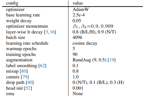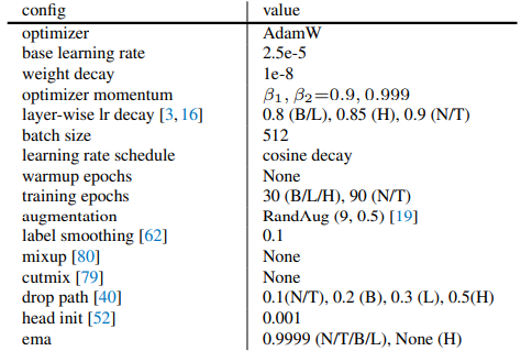 - End-to-end IN-1K fine-tuning setting for Base (B), Large (L), and Huge (H) models
