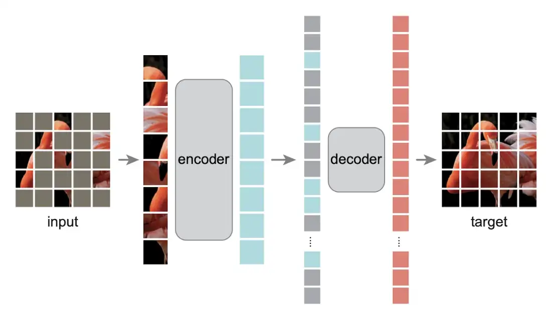 此处,这是一个非对称的编解码器,这意味着其应用了一个相当轻量的解码器,而编码器的输出便是输入图像块的潜在向量表示。而 MAE 的关键步骤之一便是利用解码器重建初始图像,其中每个掩码标记都是一个共享的学习向量,表示存在缺失的补丁。解码器则接收潜在表示以及掩码标记作为输入,并输出每个补丁的像素值,包括掩码。根据此信息,可以将原始图像拼凑在一起,以根据用作输入的掩码图像形成完整图像的预测版本。