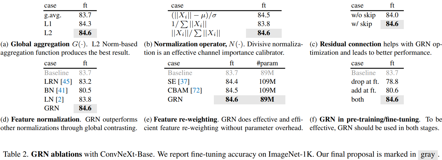如上表所示,作者将 GRN 与三个广泛使用的归一化层进行了比较,即局部响应归一化(LRN)、批量归一化(BN)和层归一化(LN)。从结果可以观察到只有 GRN 可以显着优于 baseline,这是由于: