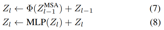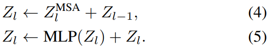然后,将MSA块的输出表示输入到MLP块,该块包括两个由GeLU激活分隔的线性层。在给定层l处,表示通过transformer块的计算流程如下: