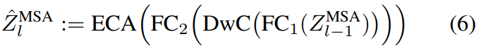 Transformer的每一层由多头自注意力(MSA)块和多层感知机(MLP)块组成。在MSA块中,Zl−1 ∈ R^(n×d),首先被投影到三个可学习embeddings {Q, K, V } ∈ R^(n×d)中。注意力矩阵A的计算公式如下: