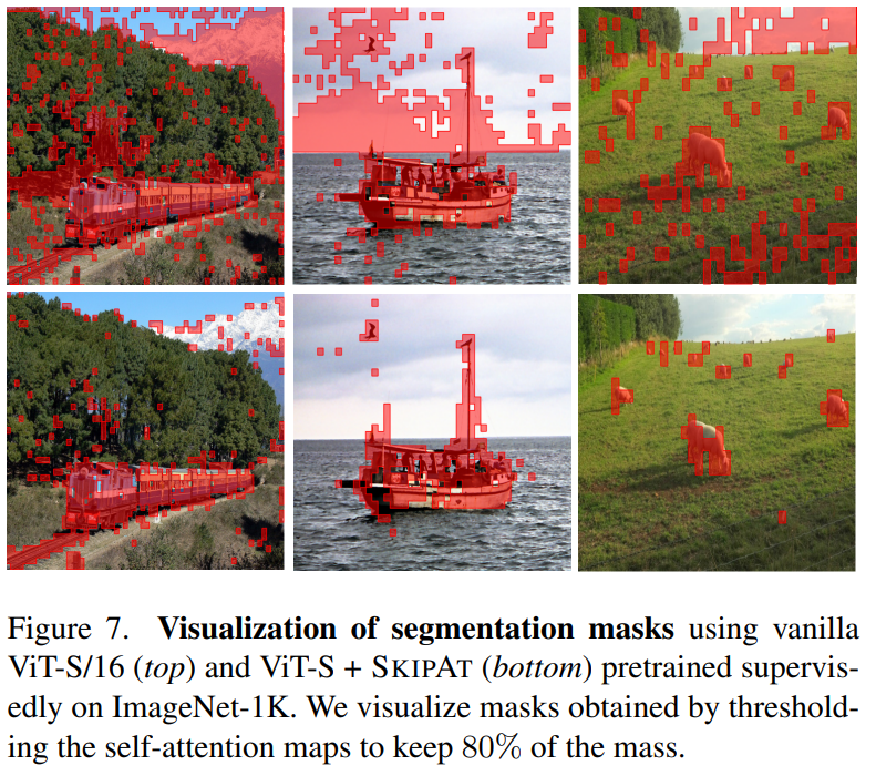 上图展示的是分割mask的可视化效果:第一行和第二行分别是原始Vit-S模型和Vit-S + SKIPAT模型。显而易见,Vit-S + SKIPAT模型对图像中前景和背景的区分度显著高于原始Vit-S模型。