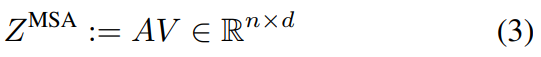 MSA中的“多头”是指考虑h个注意力头,其中每个头是一个n × d/h 矩阵的序列。使用线性层将注意头重新投影回n × d,并与值矩阵结合,公式如下所示: