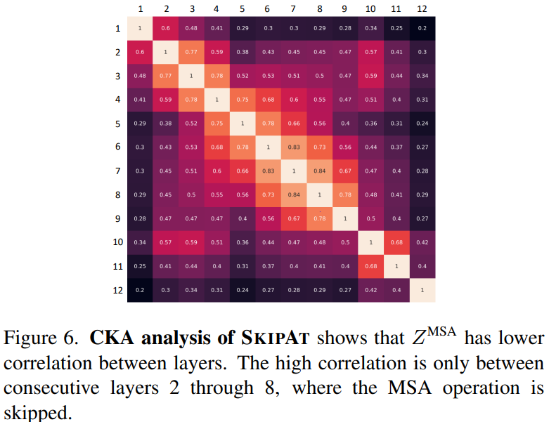 在ViT中,高相关性不仅局限于A[CLS],MSA块的表示ZMSA也在整个模型中显示出高度相关性。为了分析这些表示之间的相似性,我们计算每对i,j∈L的ZMSAi和ZMSAj之间的CKA。我们从从本节图2中观察到,Z^MSA在模型的相邻层之间也具有很高的相似性,特别是在较早的层,即从第2层到第8层。