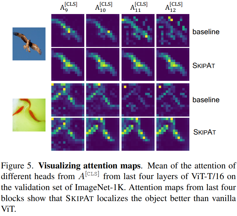 上图展示的是注意力图的可视化效果:对比原始Vit-S模型(baseline),Vit-S + SKIPAT模型对目标的定位能力有明显提升。