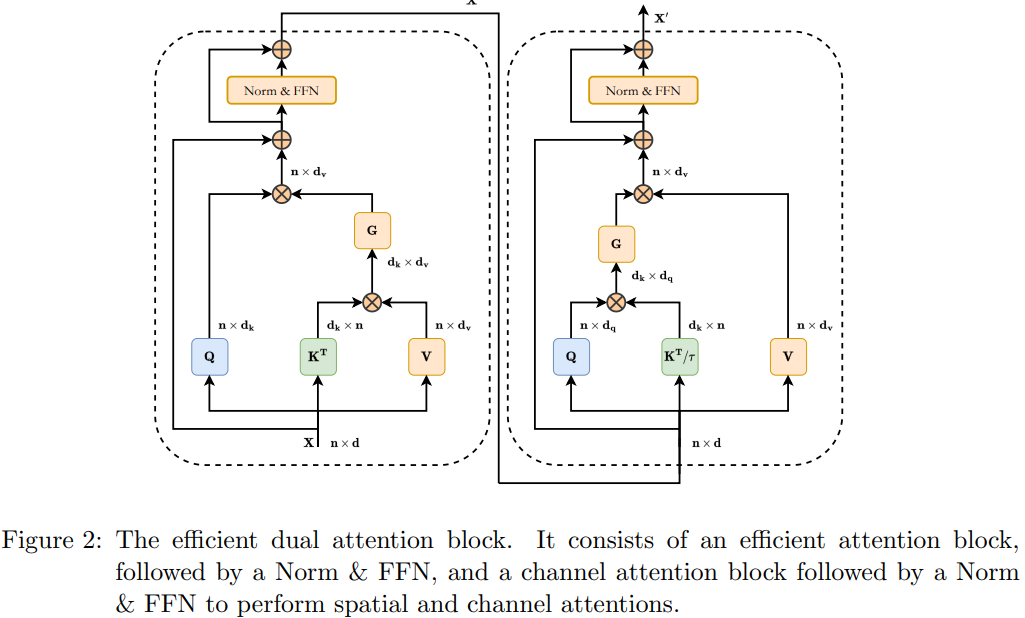 通常来说,结合空间注意力和通道注意力可以有效增强模型捕获更多上下文特征的能力。因此,本文构建了一个结合转置(通道)注意力和高效(空间)注意力的双 Transformer 块。该高效双注意力模块的结构如下图所示: