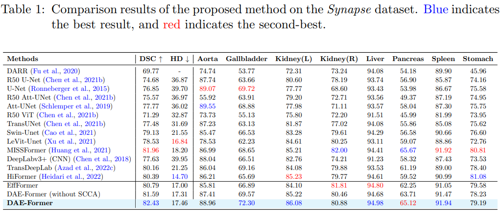 本文提出了一种新颖的类 U-Net 分层纯 Transformer —— DAE-Former,它在全特征维度上同时利用空间和通道注意力。该方法通过包含双重注意力来丰富表示空间,同时与以前的架构相比保留相同数量的参数。此外,DAE-Former 还通过跳过连接交叉注意力来执行多尺度特征的融合。所提方法在突触和皮肤病变分割数据集上均取得了 SOTA 结果,从而大大超越了基于 CNN 的方法。