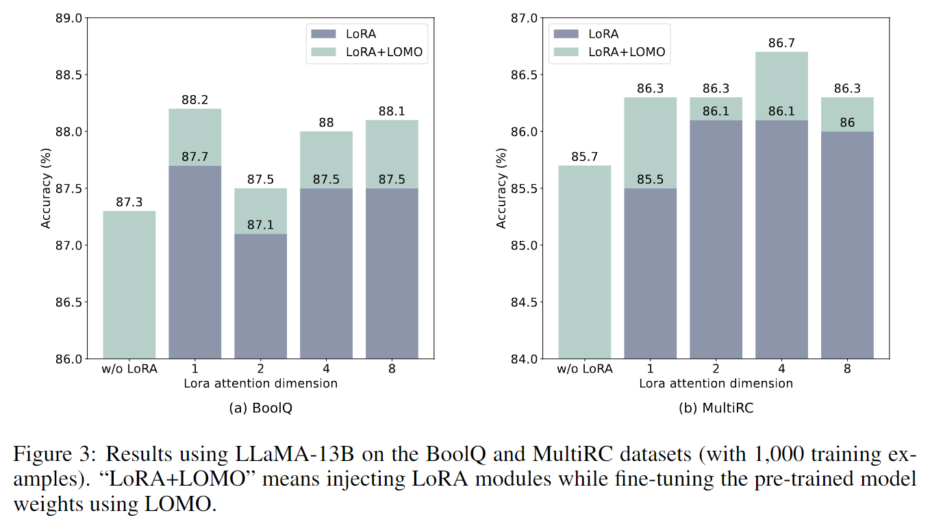 使用LLaMA-13B模型在BoolQ和MultiRC数据集上的结果(使用1,000个训练样例)。"LoRA+LOMO"表示在使用LOMO对预训练模型权重进行微调时,注入了LoRA模块。