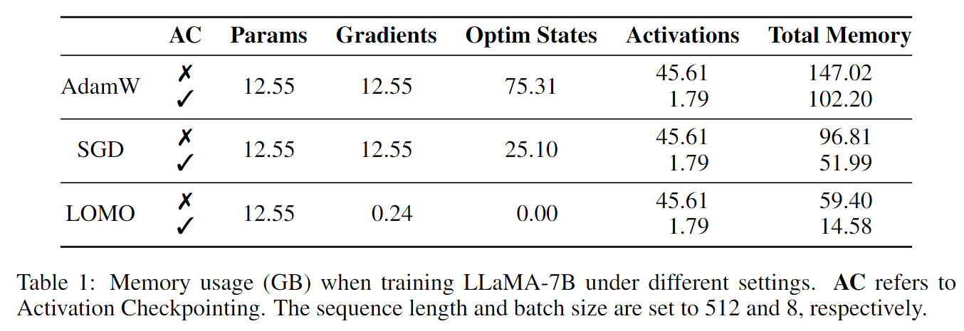 - 本文提出的优化器LOMO将梯度张量的内存使用降低到O(1),相当于最大梯度张量的内存使用。