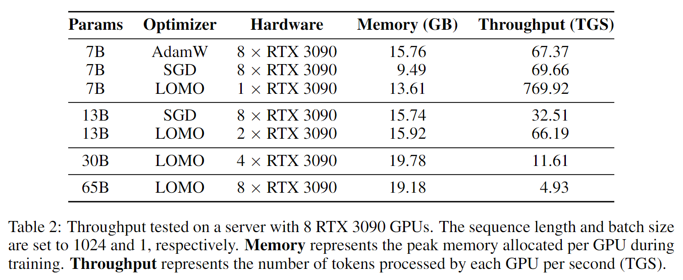 - 通过对内存使用和吞吐性能进行彻底评估,我们从实证上验证了LOMO在资源有限的情况下优化LLMs的有效性。