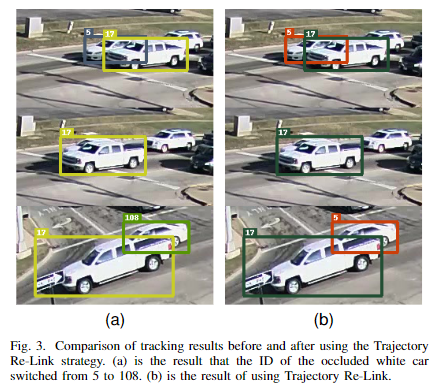 在严重遮挡情况下,目标检测可能很困难,如图3a所示,白色车辆在被遮挡后轨迹ID发生切换。这是因为车辆启动时速度的急剧变化导致卡尔曼滤波器无法准确预测运动状态。为了解决这个问题,我们首先过滤掉在场景中间结束或开始的轨迹。然后,我们使用贪婪算法根据它们的ReID特征的余弦距离合并断裂的轨迹。如图3b所示,轨迹重新链接策略能够在遮挡后仍保持白色车辆的相同跟踪身份。