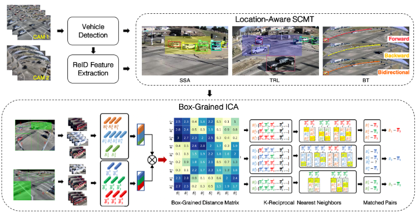 Detector:负责检测场景中的所有车辆对象;ReID: 特征提取:提取相应的外观特征;SCMT:接收检测到的边界框及其特征作为输入,并为每个单独的对象在单个摄像头视图中生成轨迹;ICA:将所有摄像头的轨迹候选进行匹配,生成最终的MCMT结果。