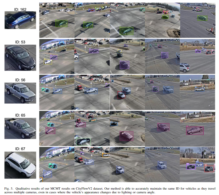 最后,所提方法在 CityFlowV2 数据集的公共测试集上评估了我们方法的性能。实验结果表明,该方法在 IDF1 得分上达到了 85.45%,是该基准任务的最高得分,创造了城市规模多摄像头多目标跟踪任务的新纪录!