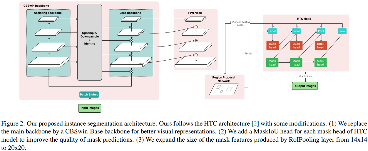 首先,作者选择了混合任务级联(Hybrid Task Cascade,HTC)作为他们的主要模型架构。与传统的使用ResNet骨干网络不同,他们决定使用CBSwin-Base骨干网络,并结合一个名为CB-FPN的特征金字塔网络。这个选择是在充分考虑模型大小和可用训练资源之间的权衡之后作出的。此决策意味着他们使用了更轻量级的骨干网络,以便在有限的训练资源下提高模型性能。
