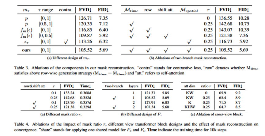 表3(a)比较了不同掩码令牌设计策略的效果,表3(b)比较了不同掩码策略的效果,实验结果显示,我们的模型在生成指标上有着显著的提升;表4(a)进一步地分析了行级别的掩码设计的影响,表4(b)验证了双分支使用独立的自注意力模块编码的影响,表4(c)验证了多视角模块的效果。